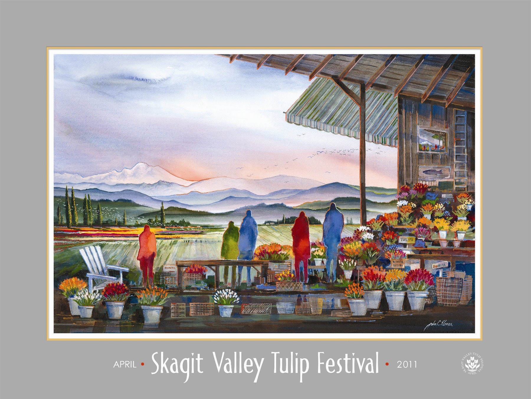 Celebrate the vibrant beauty of the Skagit Valley with this 2011 festival magnet, featuring the official poster art by John Ebner. Ebner's watercolor painting showcases his signature "rain people" style, capturing the essence of spring in the valley.