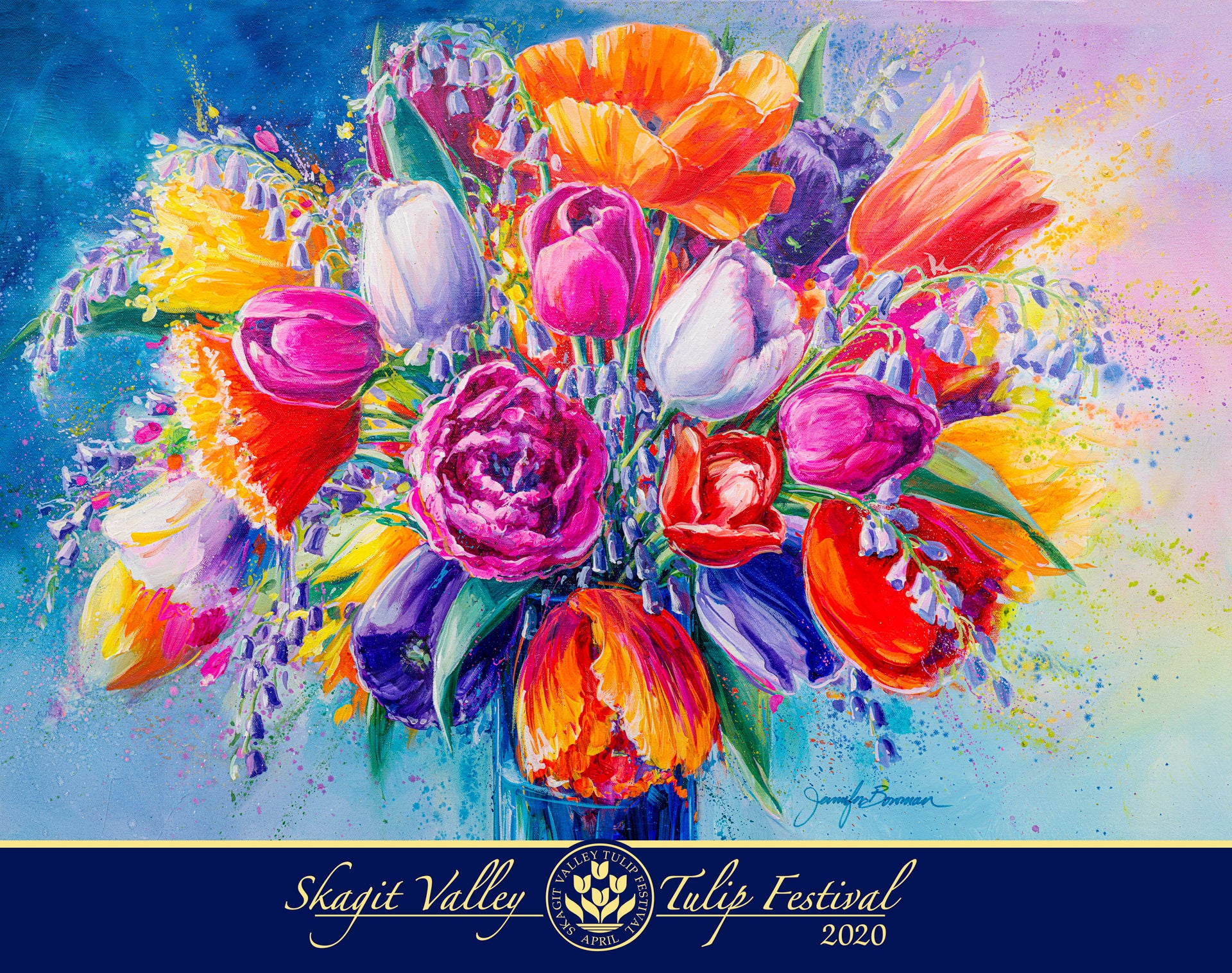 Celebrate the resilience and beauty of the Skagit Valley with this vibrant 2020 festival magnet. Designed by Jennifer Bowman, an award-winning artist, the poster titled “Fourth of July for Tulips” features a striking acrylic painting that bursts with color and energy.
